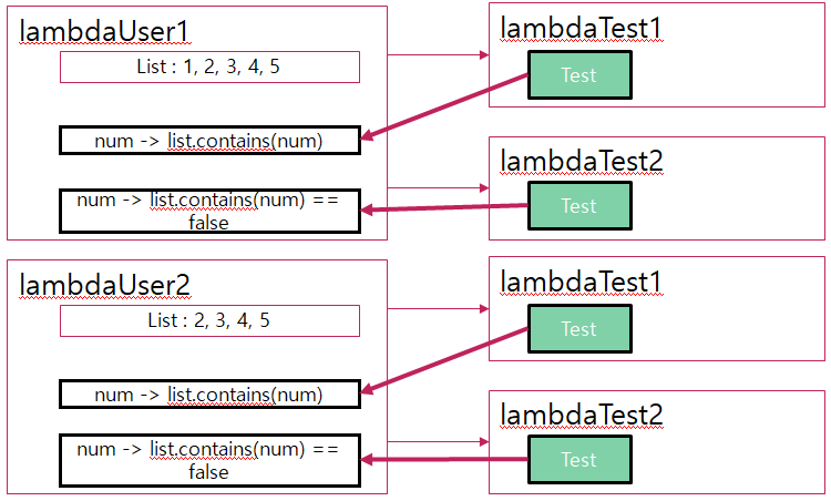 예제 코드는 { num -> list.contains (num) } 가 내부 객체로 생성되고 그 참조가 LamdaTest 에 전달된다.